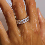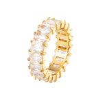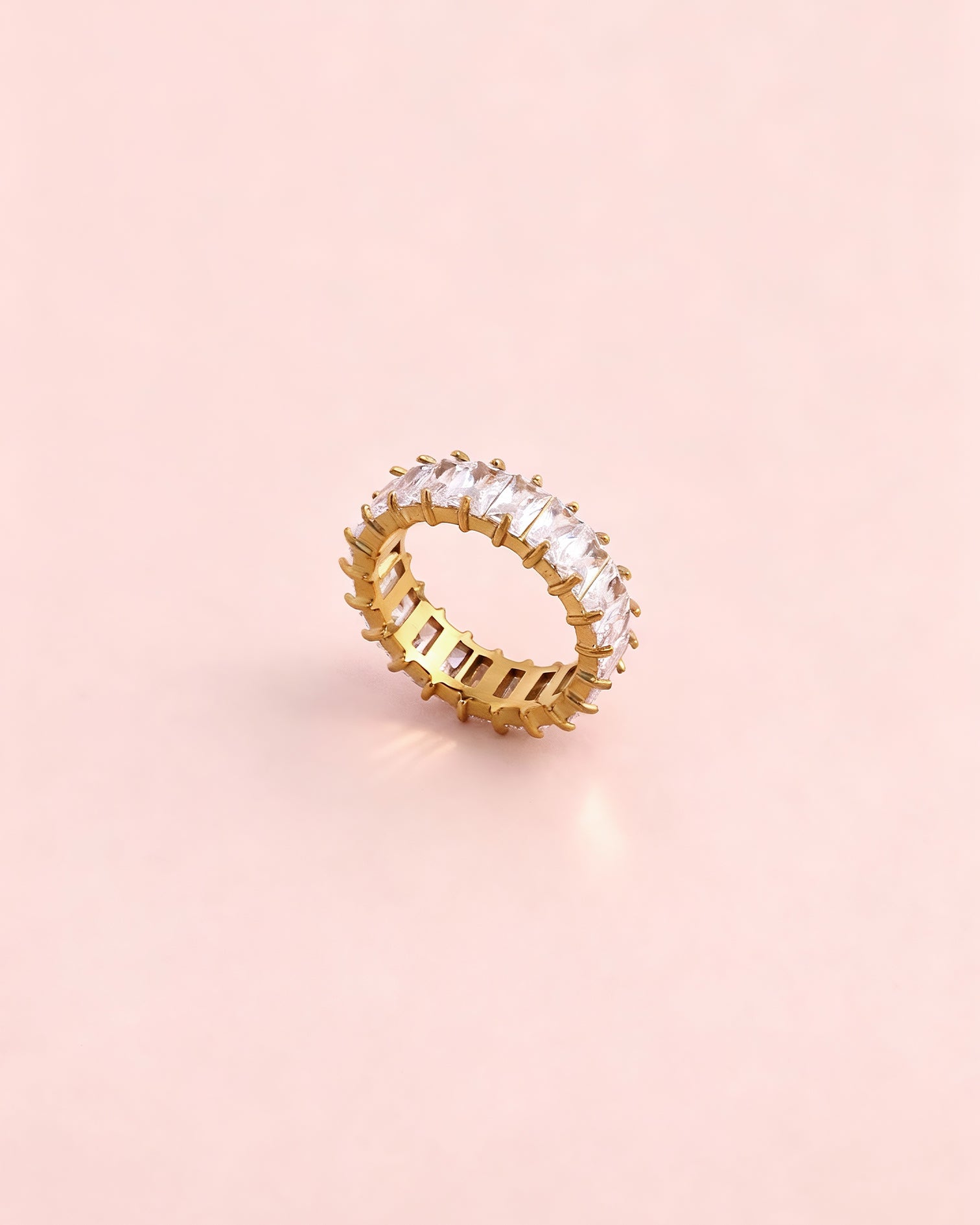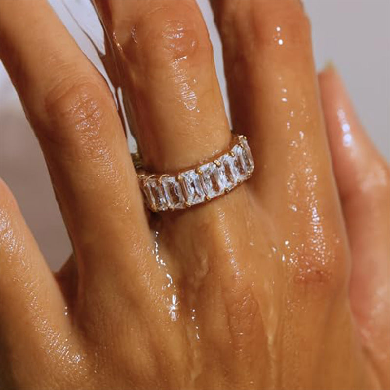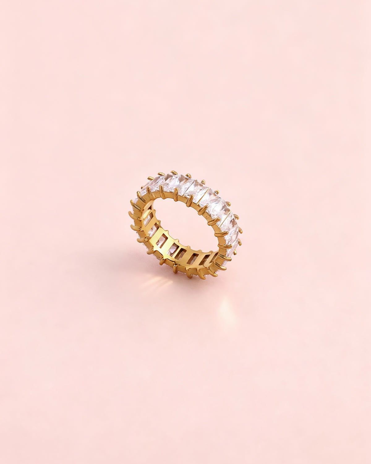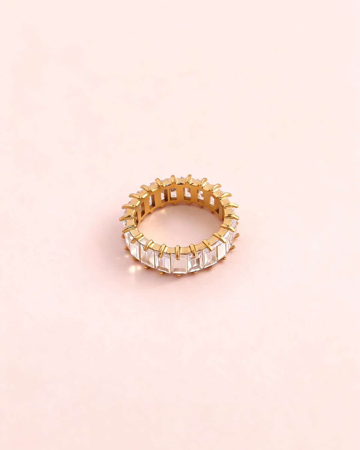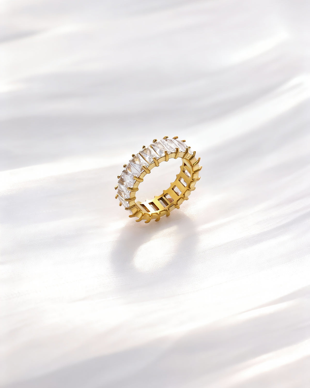 Style: Eternity band ring Stone Cut: Baguette-cut zircon Setting: Full pavé, continuous band Profile: Slim, stack-friendly design Finish: High-polish Sizes: US 7 / 8 / 9