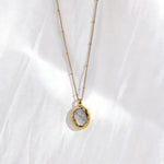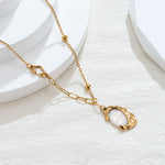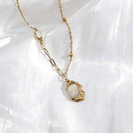 The Molten Ember Necklace features a centerpiece of luminous white mother-of-pearl, encased in a uniquely textured gold frame that mimics the movement of liquid metal. This striking contrast between the structured "molten" ripples and the soft, natural glow of the shell creates a sophisticated focal point for any professional ensemble. Whether paired with a sharp blazer for a keynote or layered over a neutral knit, it serves as a modern talisman of resilience and grace.
