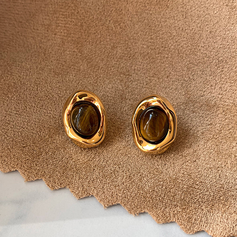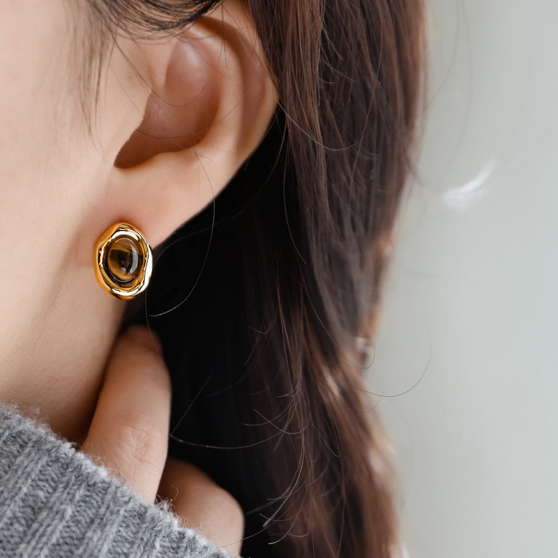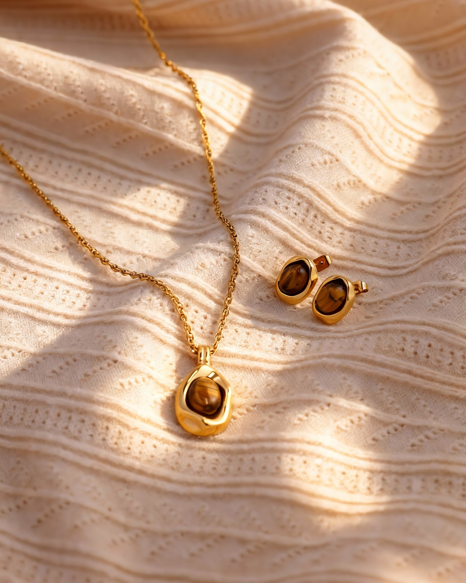 A warm, grounded set centered around natural Tiger Eye—made to feel calm on the skin and quietly polished in any light. The stone’s signature shimmer shifts as you move, framed by a smooth, gold-toned bezel that gives the piece a clean, vintage-leaning finish without feeling overly decorative.