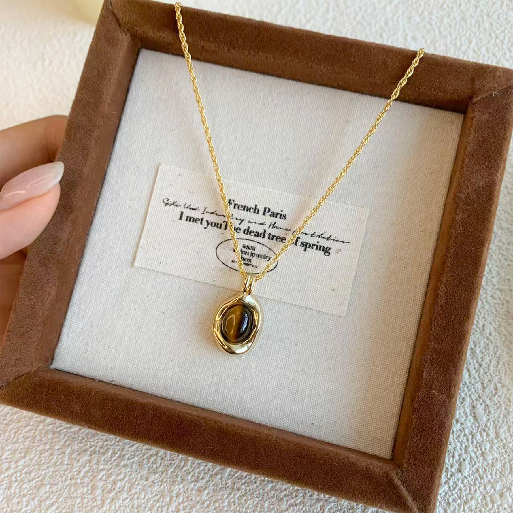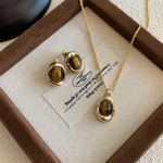 Set Includes: 1 Pendant Necklace + 1 Pair Stud Earrings Stone: Natural Tiger Eye (each stone varies slightly in pattern and tone) Setting: Smooth bezel-set frame with a rounded, polished edge Style: Warm vintage feel, minimal and easy to pair Closure: Classic lobster clasp Fit: Designed to rest naturally at the collarbone