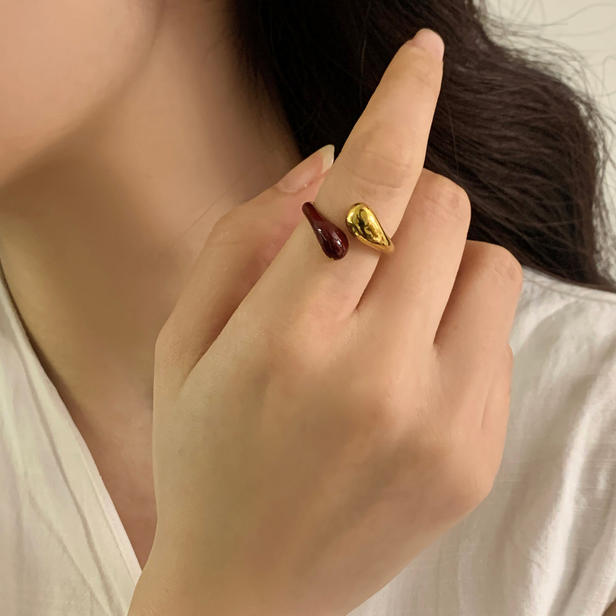 This open cuff captures the beauty of two fluid forms converging. On one side, a droplet of polished 18k gold; on the other, a rich, glossy "Ankara Red" enamel glaze.
