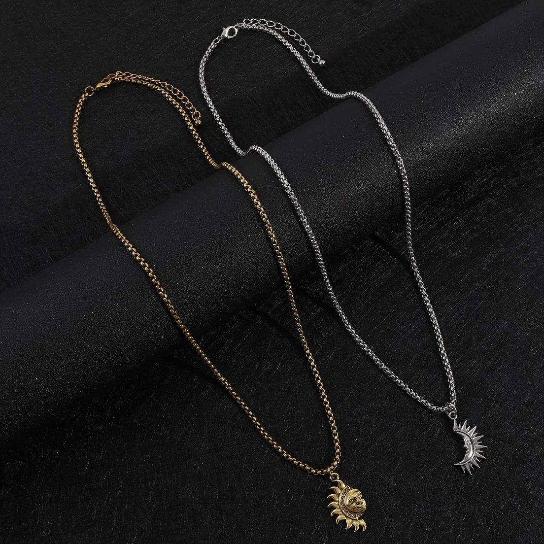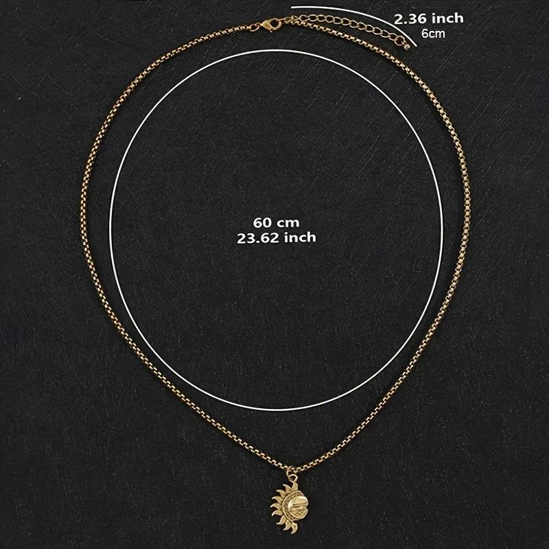 Material: 18k Gold & Silver Style: Matching Necklaces (1 Sun + 1 Moon) Length: 60cm + 6cm (23.6in + 2.3in) Performance: Waterproof, Sweat-proof & Tarnish-resistant Safety: 100% Hypoallergenic; Fit Tip: The perfect length for daily wear, keeping your counterpart close to your heart.