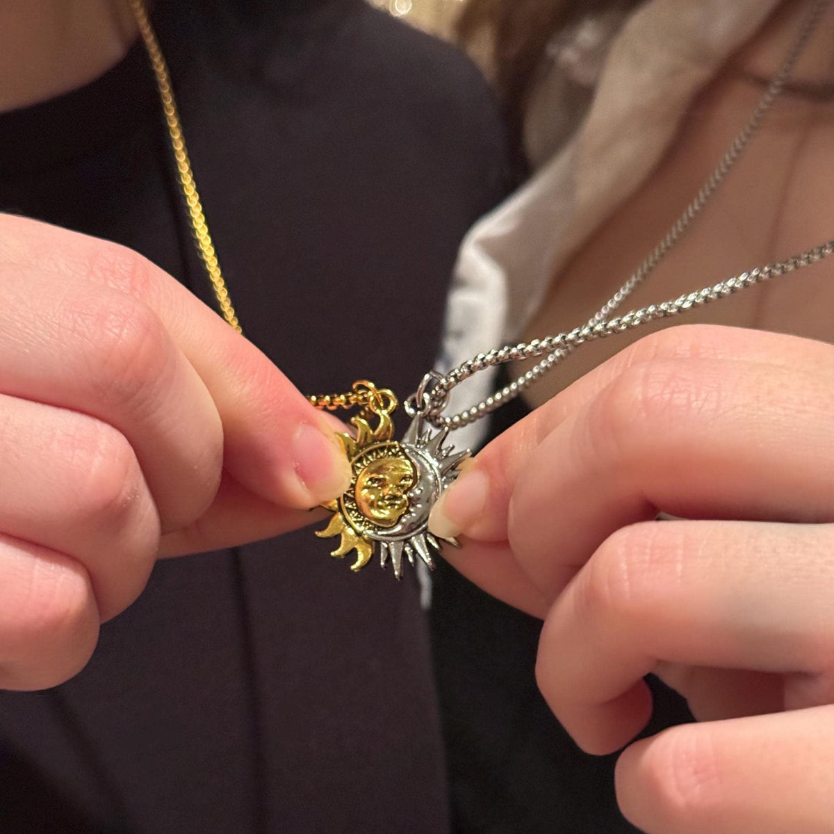 Love between two driven individuals is a partnership of equals. Keep the golden sun close to your heart, and give the silver moon to your counterpart. Though worn on different bodies, their intricate profiles are sculpted to interlock into one perfect, unbreakable circle when you finally embrace.