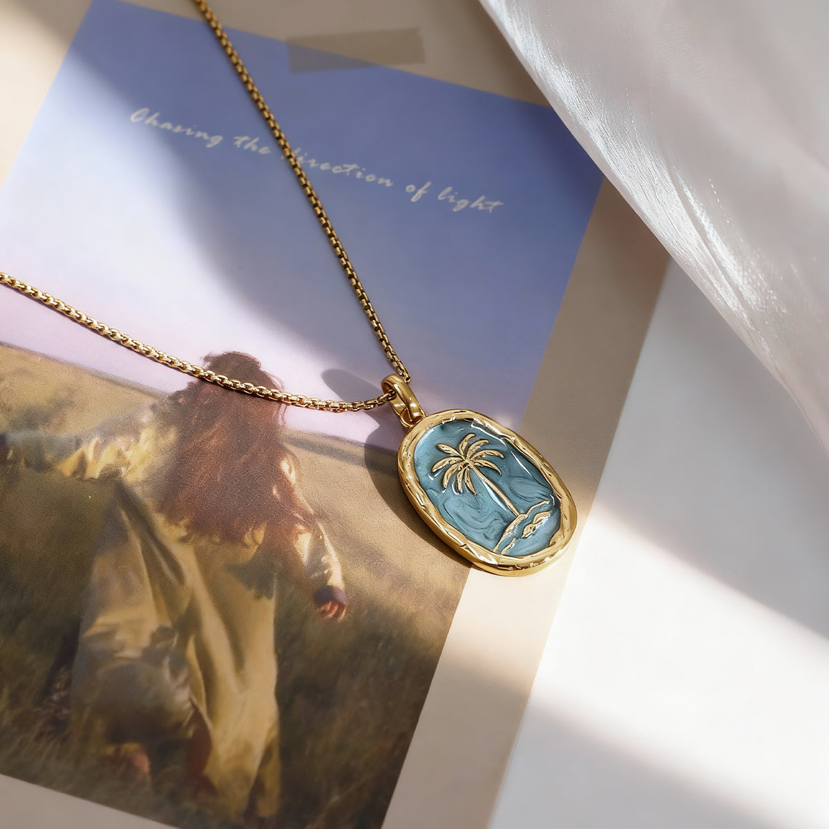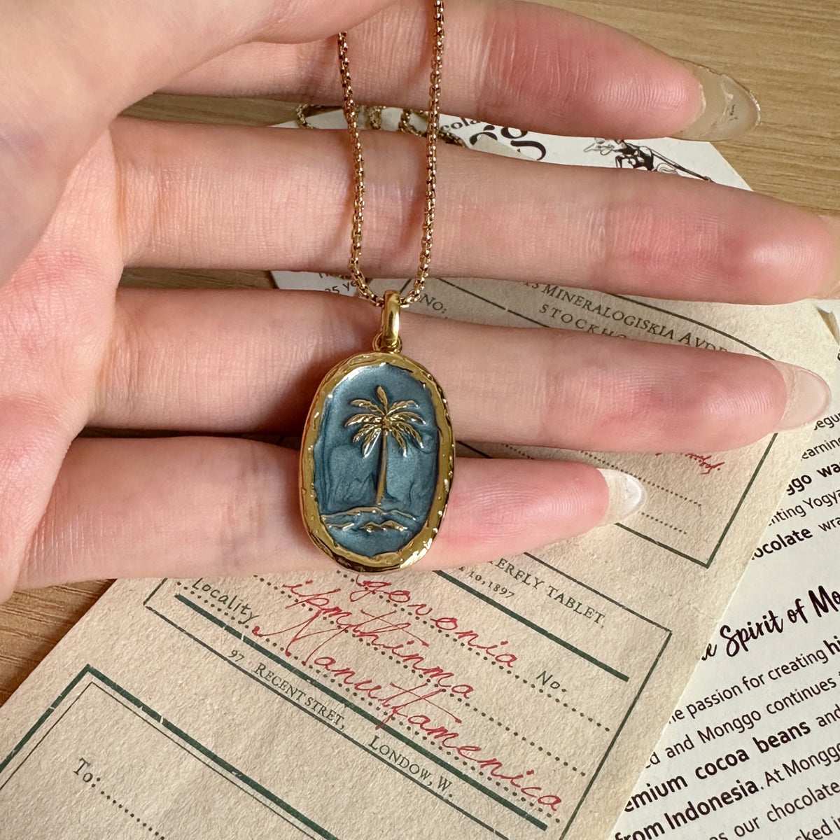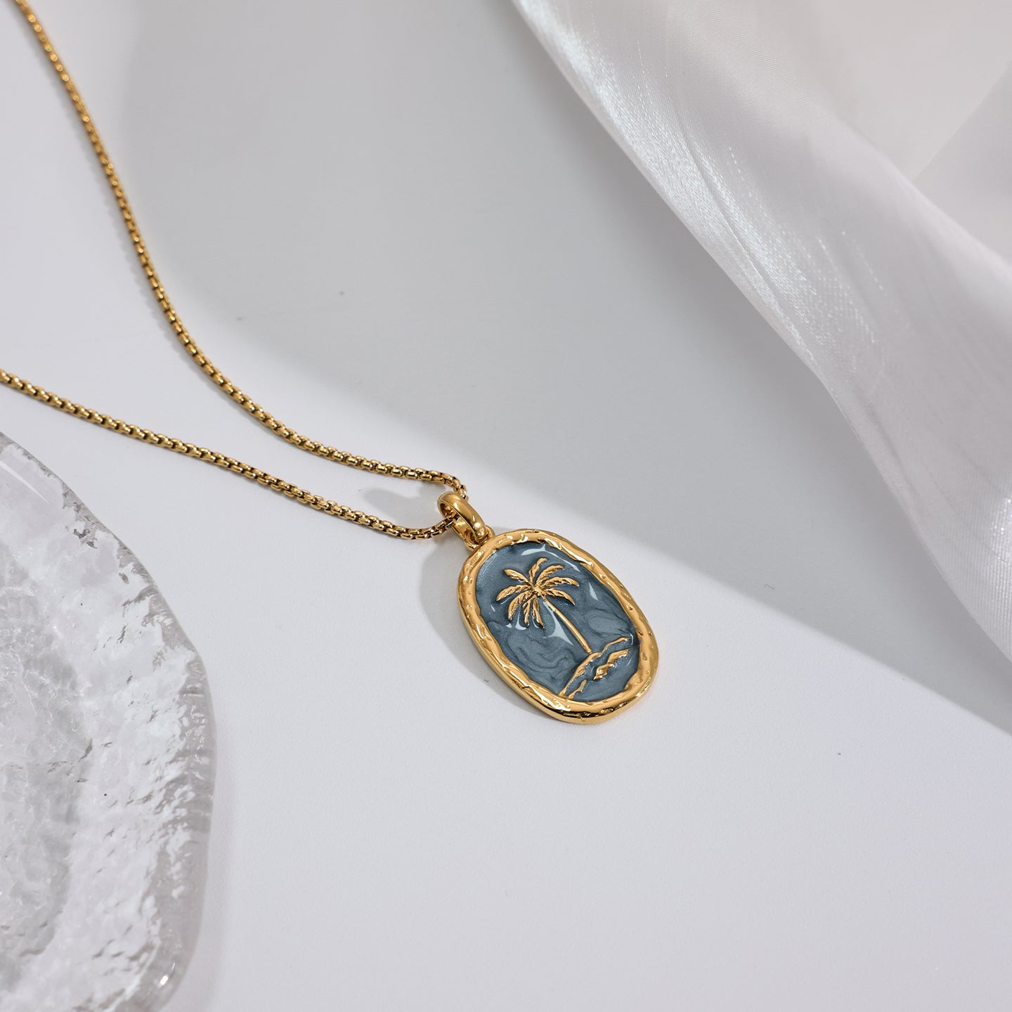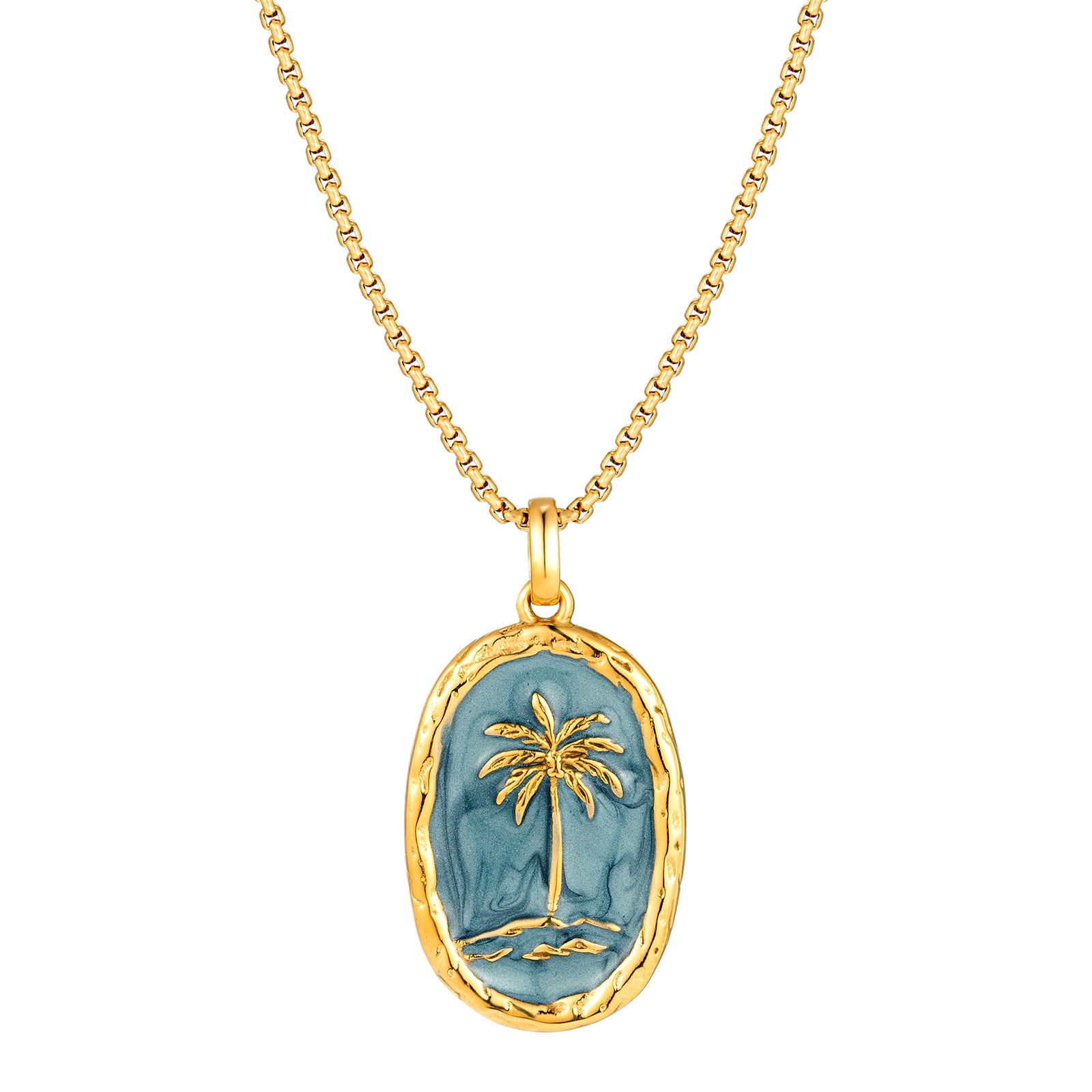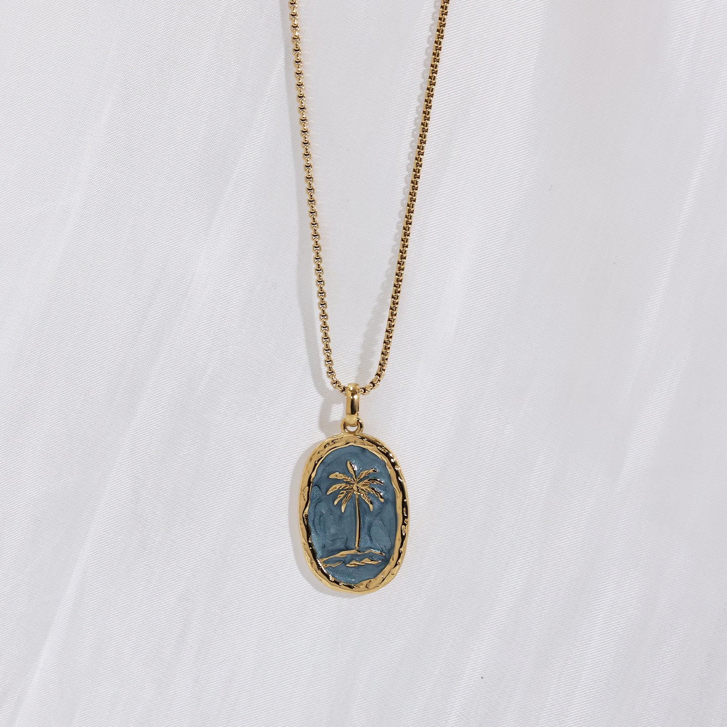 Inspired by coastal days and slow summer moments, this palm tree pendant captures the ease of ocean living. The soft blue enamel recalls clear skies and calm water, while the palm motif brings a sense of warmth and escape—familiar, relaxed, and effortless.