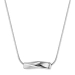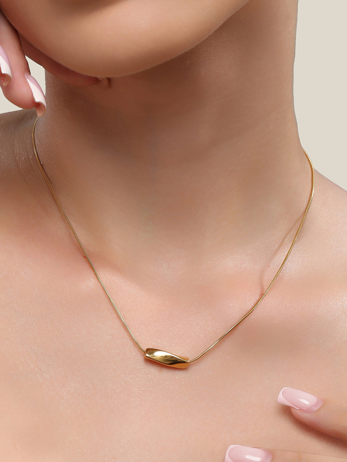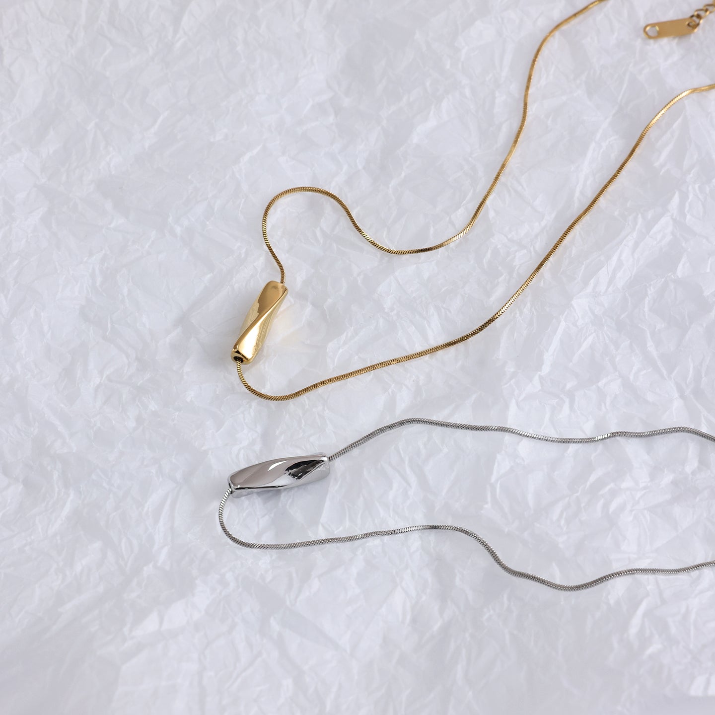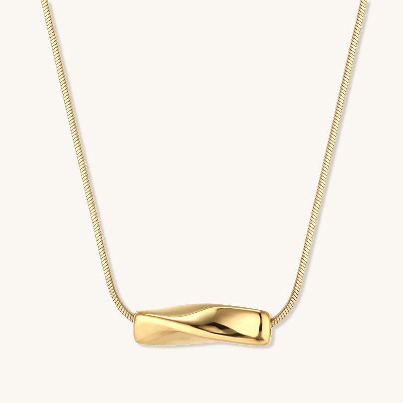 The Mobius Twist Bar Necklace features a fluid, geometric pendant with a delicately rippled texture that catches the light from every angle. Suspended on a high-polish snake chain, this piece offers a seamless "liquid-metal" aesthetic that transitions effortlessly from structured boardroom meetings to refined evening socials. Its understated silhouette makes it an essential staple for the woman who defines her style through intentional, minimalist details.