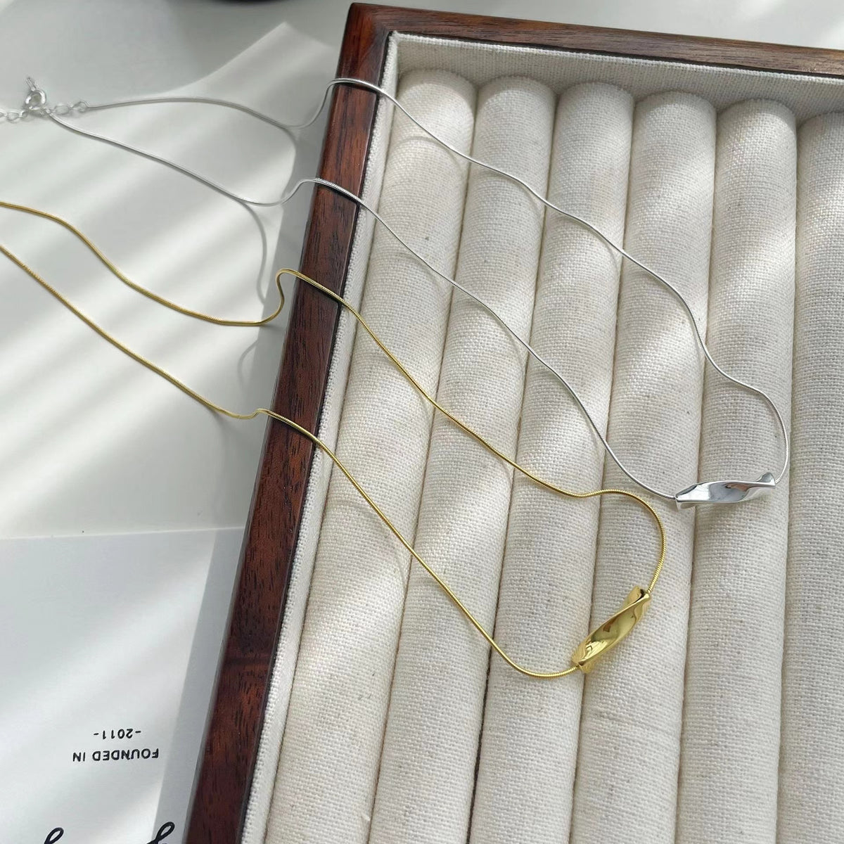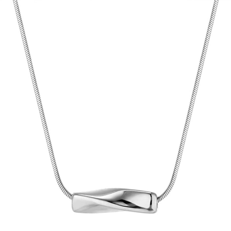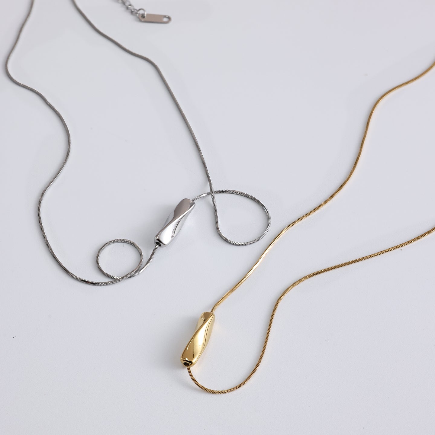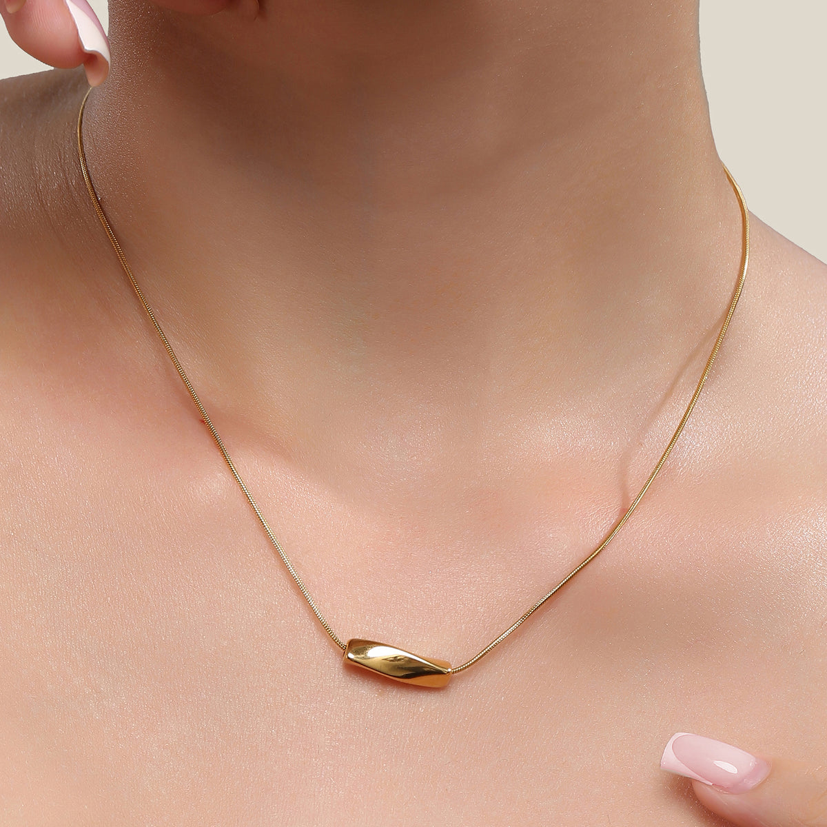 The Mobius Twist Bar Necklace features a fluid, geometric pendant with a delicately rippled texture that catches the light from every angle. Suspended on a high-polish snake chain, this piece offers a seamless "liquid-metal" aesthetic that transitions effortlessly from structured boardroom meetings to refined evening socials. Its understated silhouette makes it an essential staple for the woman who defines her style through intentional, minimalist details.