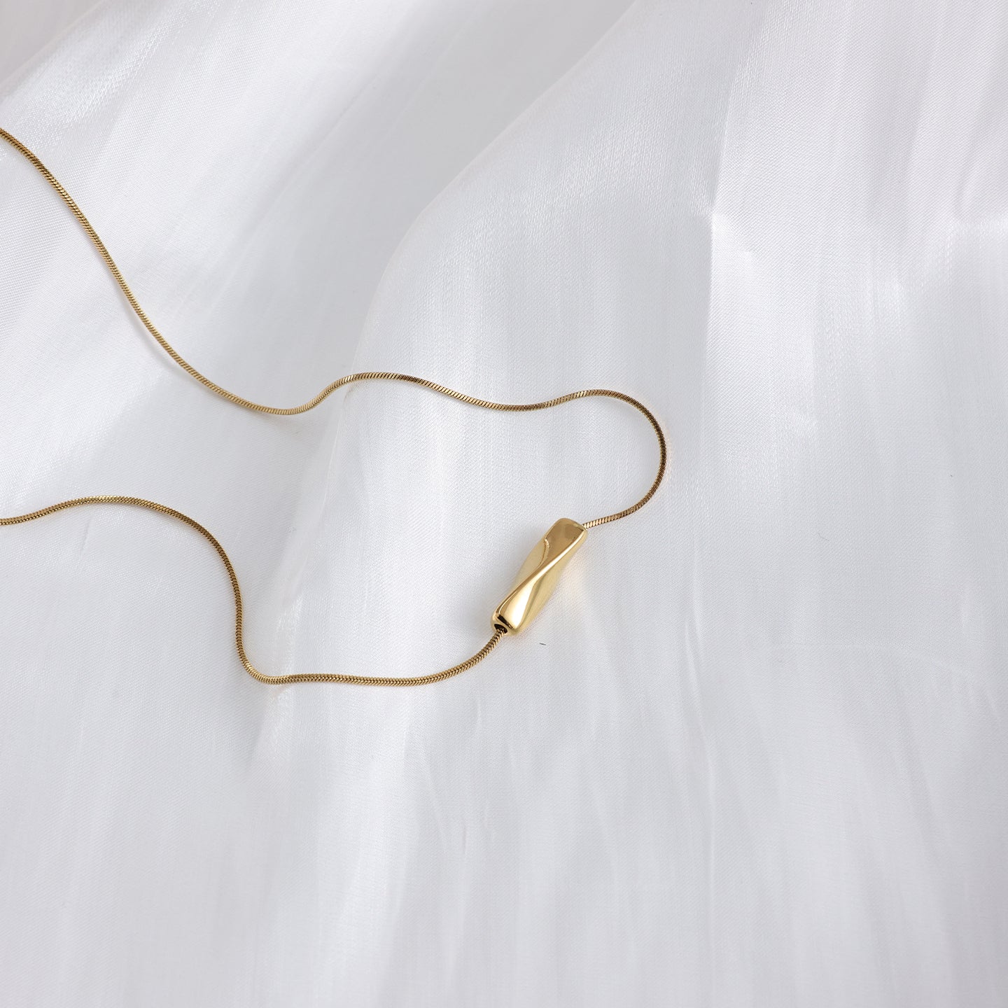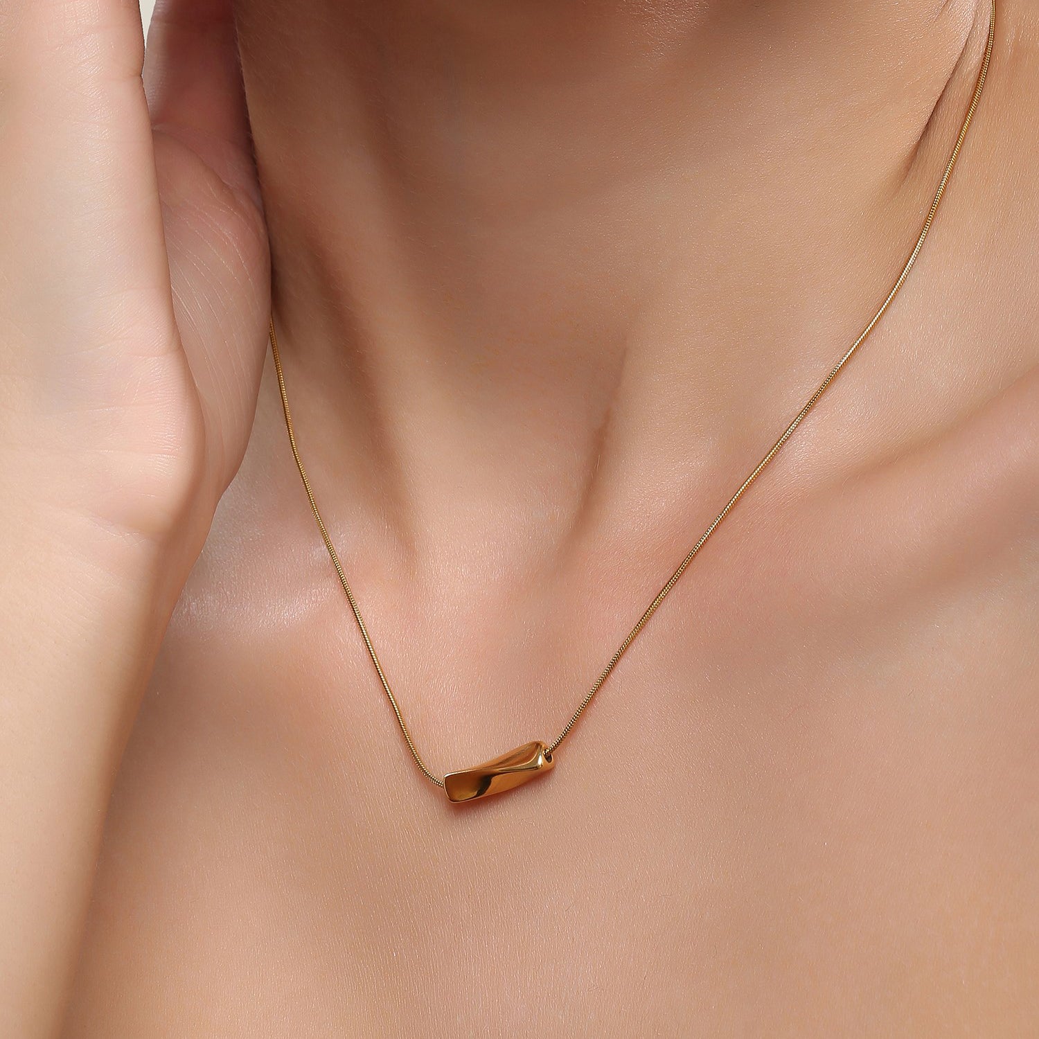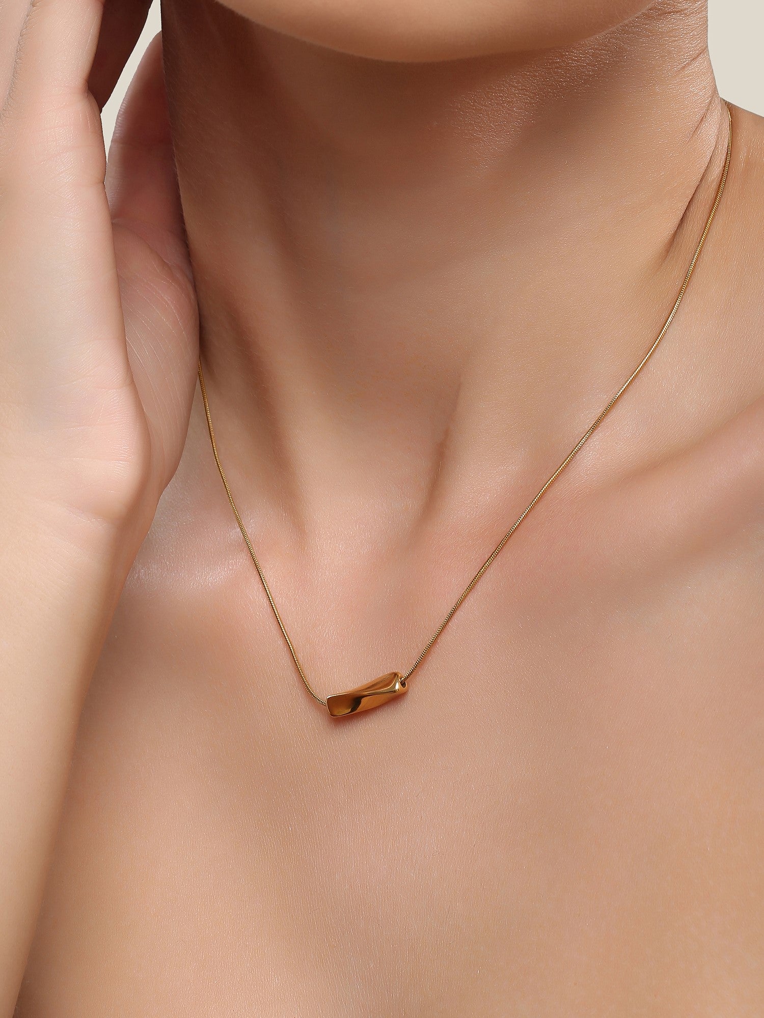 Role: Minimalist architectural staple / Professional signature piece. Dimensions: Geometric bar pendant on a high-polish snake chain. Weight: 5.7g (0.2oz) — Engineered for a substantial feel without day-long fatigue. Chain: Smooth-gliding snake chain — Designed to be snag-free against silk and luxury fabrics.