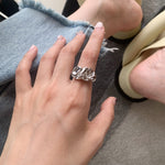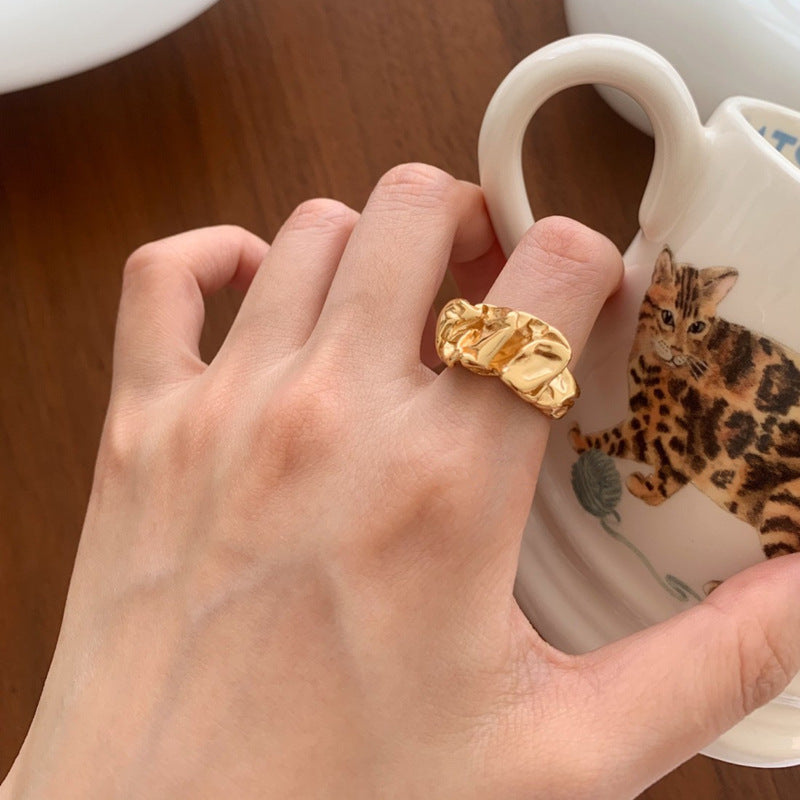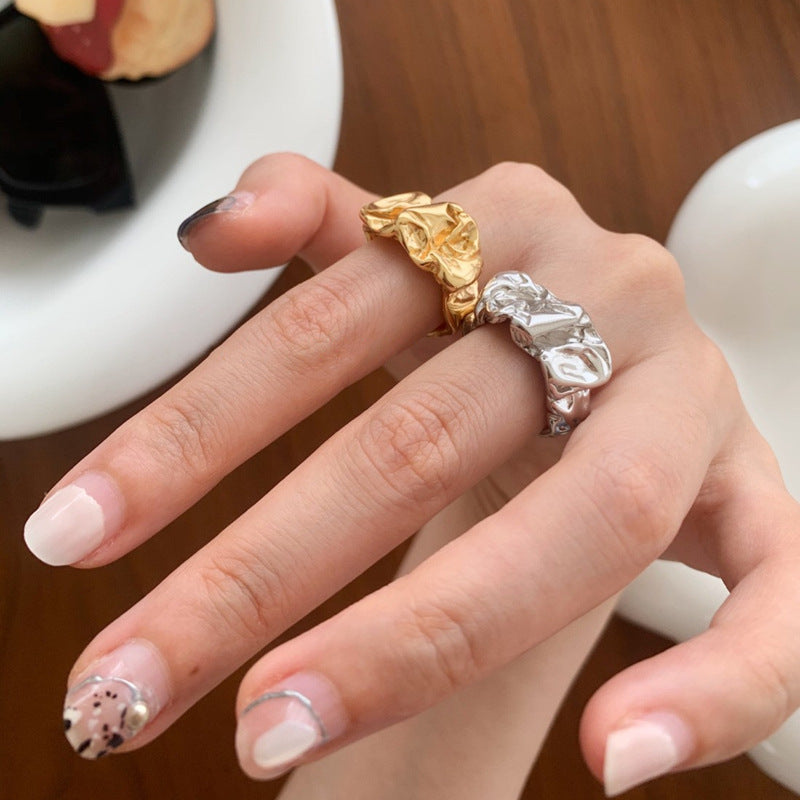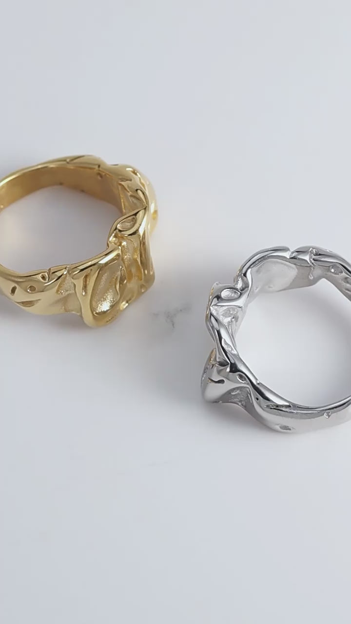 Material: 18k Gold Plated/Sterling Silver Style: Organic Molten Texture / Irregular Folds. Band Width: Variable (Approx. 0.4cm - 0.6cm). Weight: Solid Weight (Sculptural Feel). Performance: Hypoallergenic, Waterproof & Tarnish-resistant. Size Guide (Inner Circumference):
