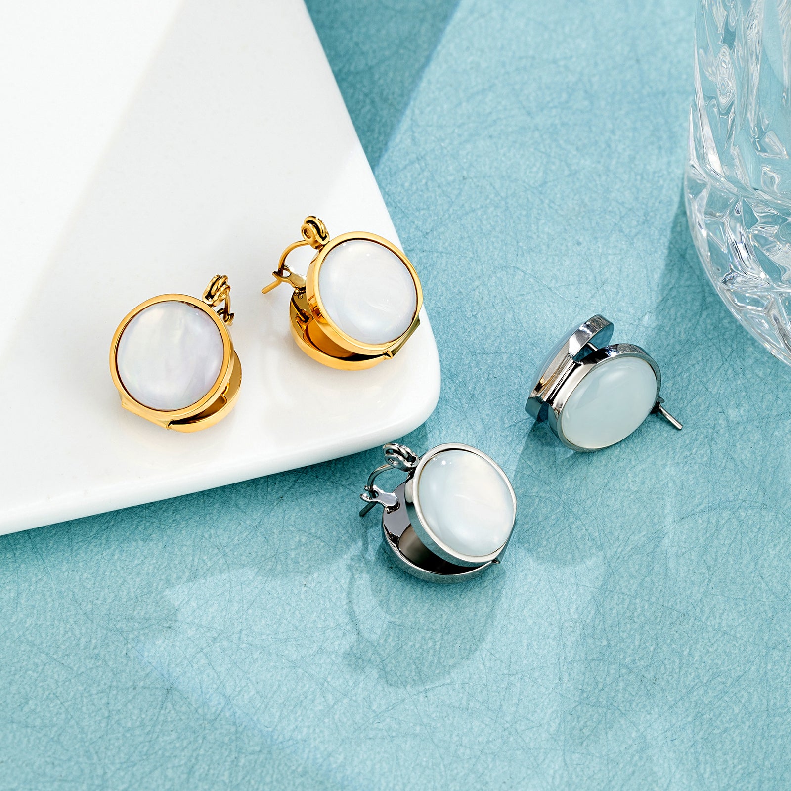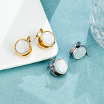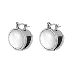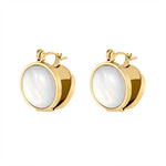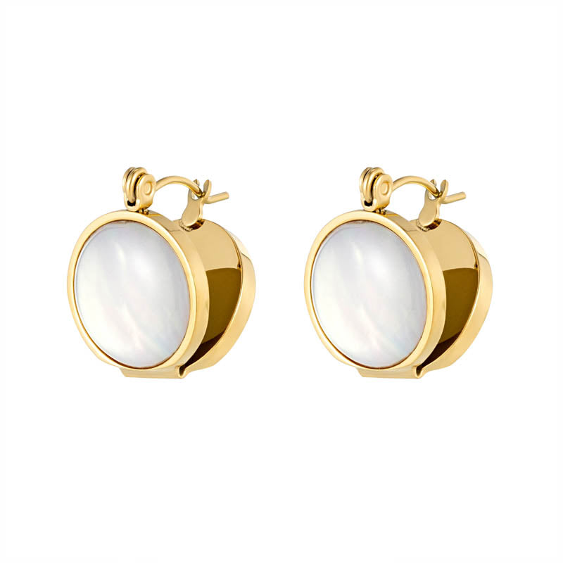 These round mother-of-pearl stud earrings catch the light softly—never loud, never trying too hard. The natural shell surface reflects subtle color shifts as you move, adding a calm, polished finish to your everyday look.