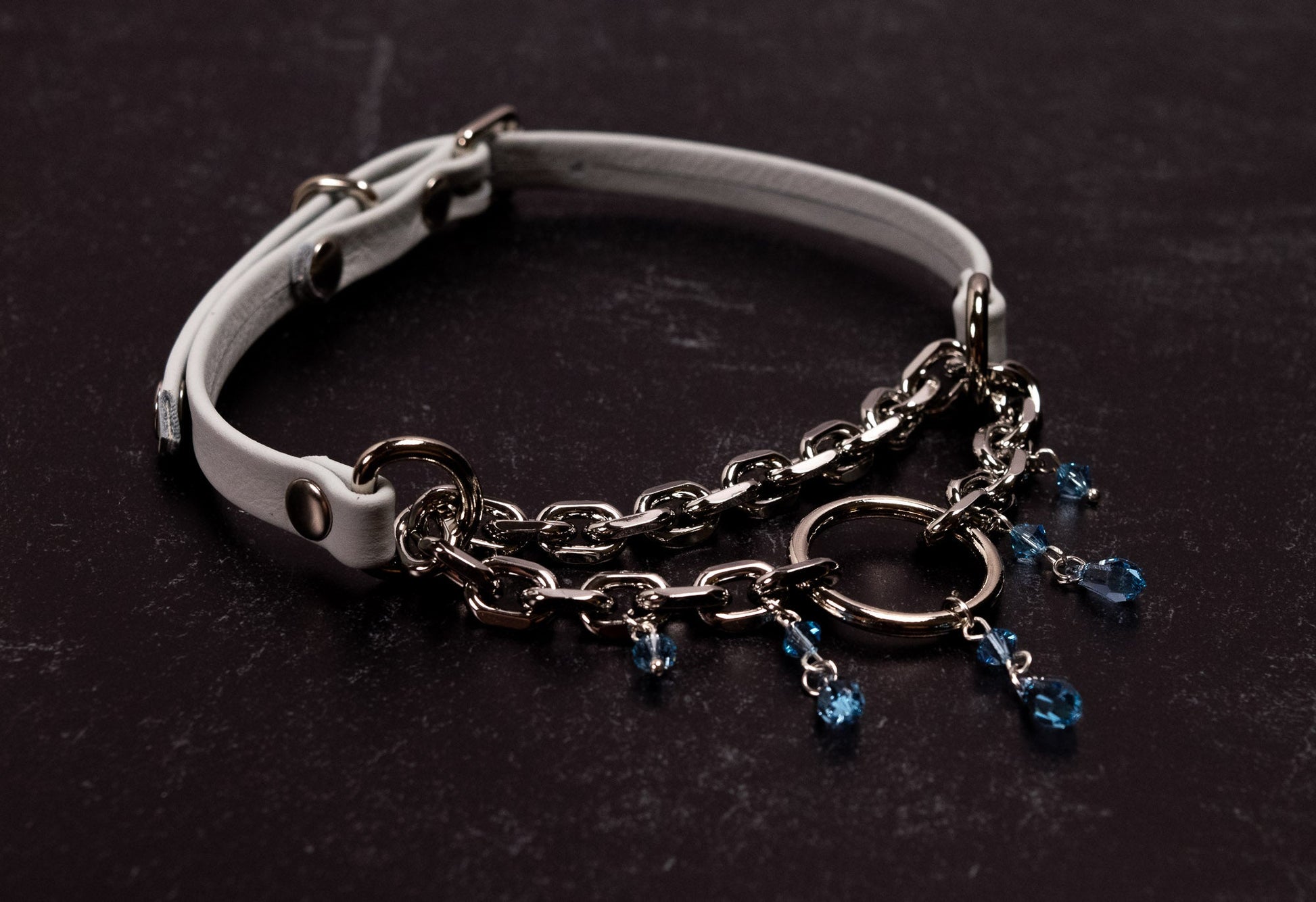 Soft slate-blue leather meets polished silver hardware, finished with hand-cut ice-blue glass crystals that shimmer like breath against winter light. The martingale O-ring structure wraps the neck in poise and surrender — a quiet ritual between control and grace.